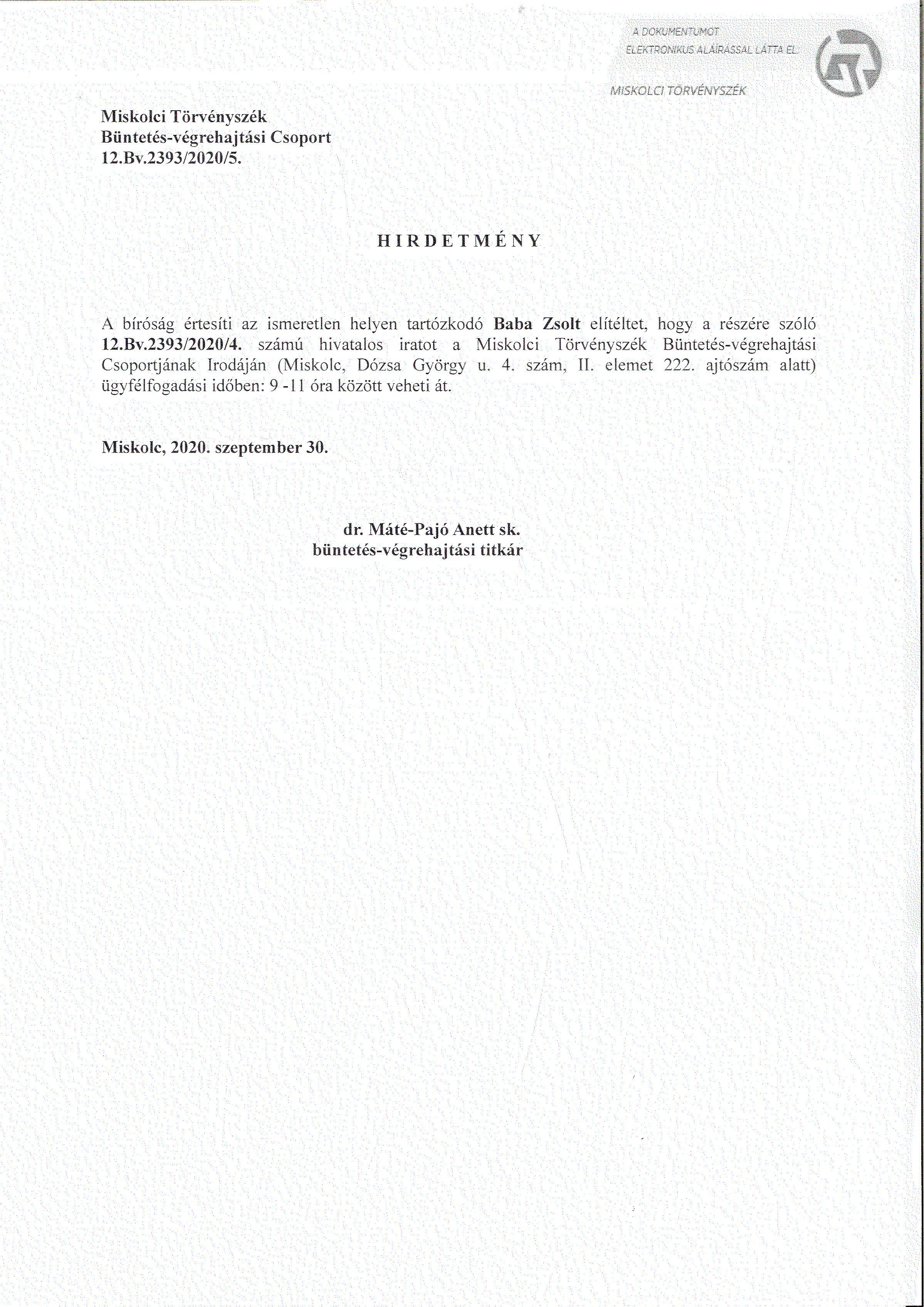 Hirdetmény kifüggesztés - Makainé László Anikó felperes A hirdetmény és csatolmánya az alábbiakban érhető el: Érdemi ellenkérelem Idézés