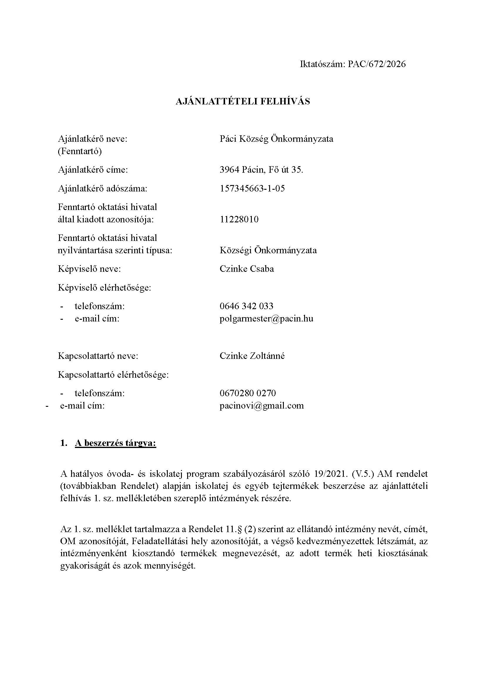 Pácin Község Önkormányzata: